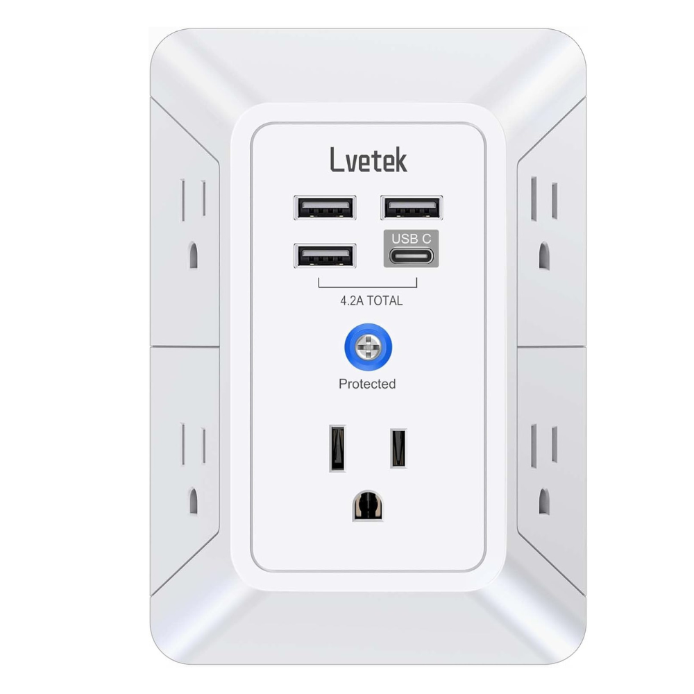 • Multi-functional Outlet Splitter: This Multi Plug Outlet Extender can turn 2 into 5, plus 4 USB Ports; 1680 joules surge protector protect electronics by improving your power quality. Wall plug design, No messy power cable, No desktop space occupation, Perfect solution for dorm room, bedside.