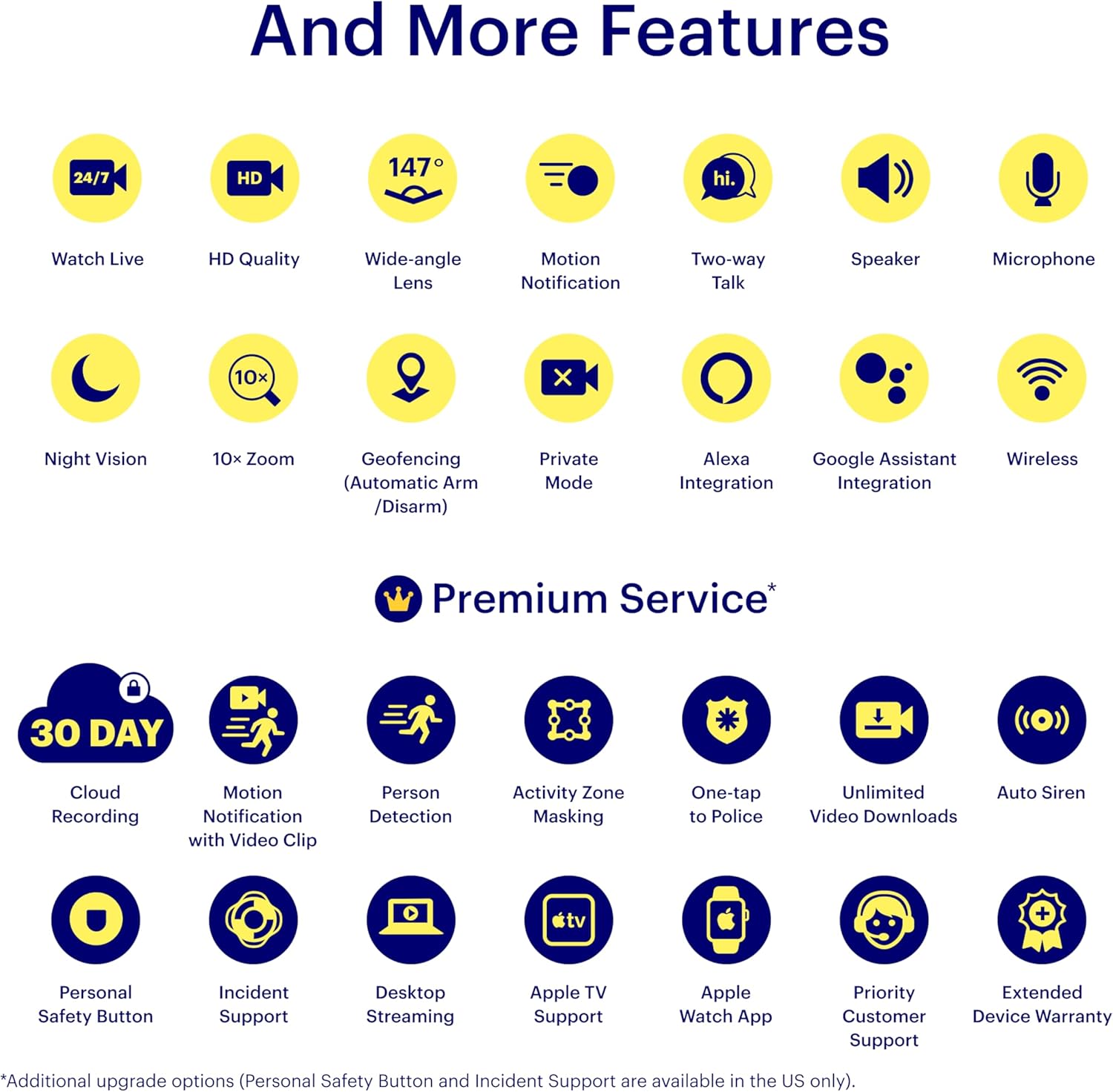 • ADDITIONAL FEATURES: 30-day video cloud history, smarter motion alerts with video clips & person detection, activity zone masking, auto siren, safety button, extended warranty & more with Premium Service plan