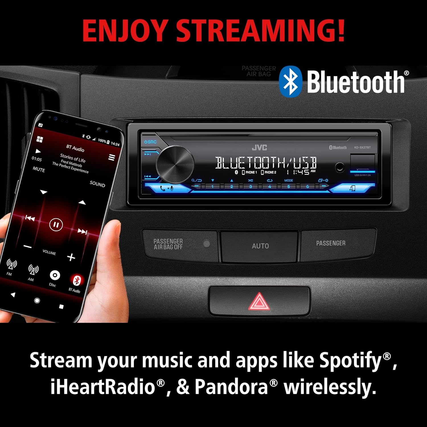 • WIRELESS DIGITAL MEDIA RECEIVER: JVC KD-SX27BT Car Stereo Receiver integrates easily into a wide range of vehicles and lets you stream music from popular music apps like Pandora & Spotify wirelessly via Bluetooth, or play stored tracks on your device