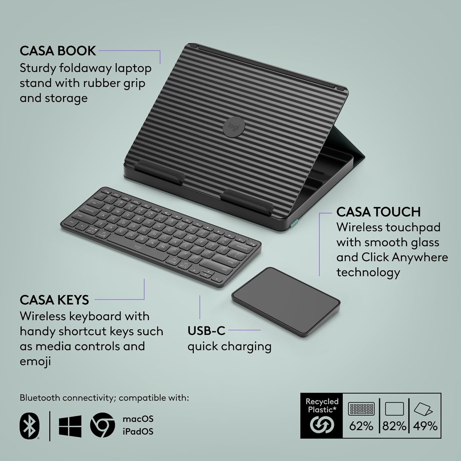 • Sustainability: Plastic parts in Casa Pop-Up Desk include certified post-consumer recycled plastic (3) (Touchpad: minimum 62%; Keyboard: minimum 47%; Book: minimum 44%)