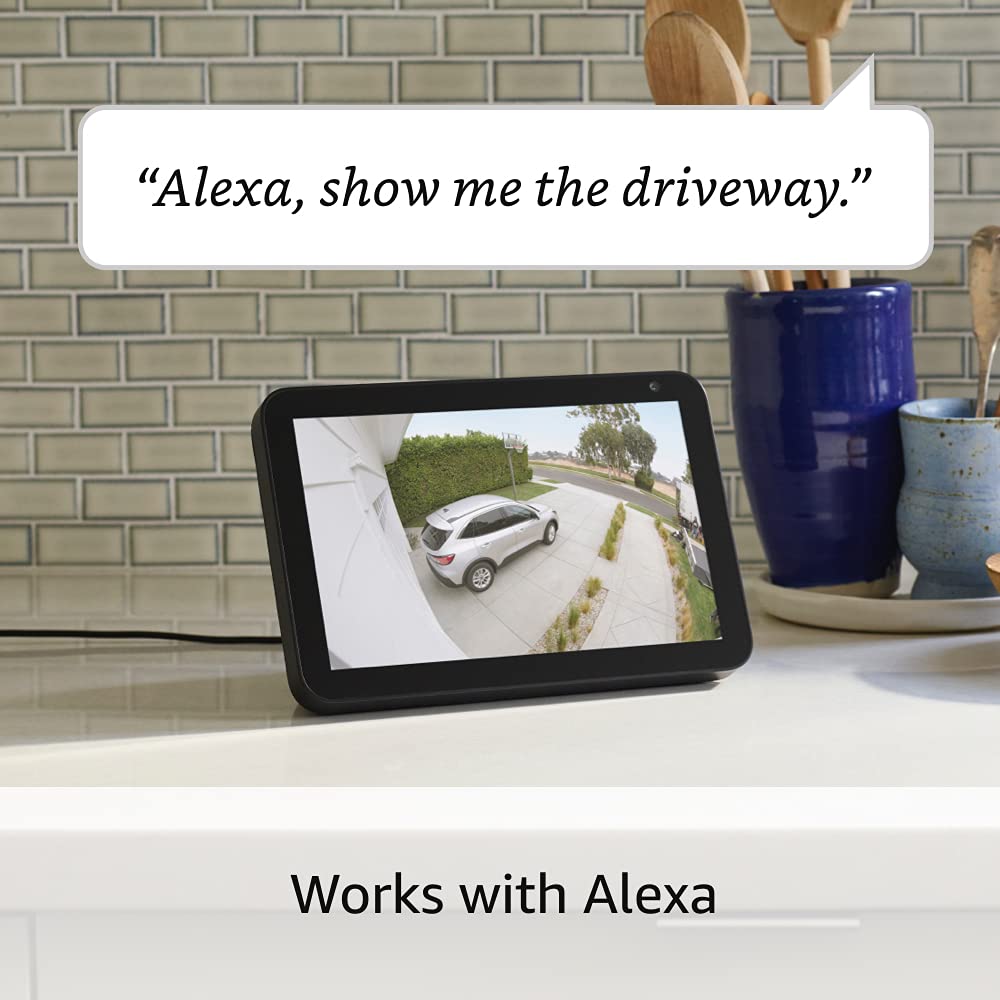 - For added peace of mind, pair with Alexa to help you keep an eye on your home. Connect with Alexa to hear motion alerts on your compatible Echo device or see a Live View with an Echo Show, Fire TV, or Fire Tablet. Talk to visitors by saying, “Alexa, talk to the front door.”