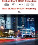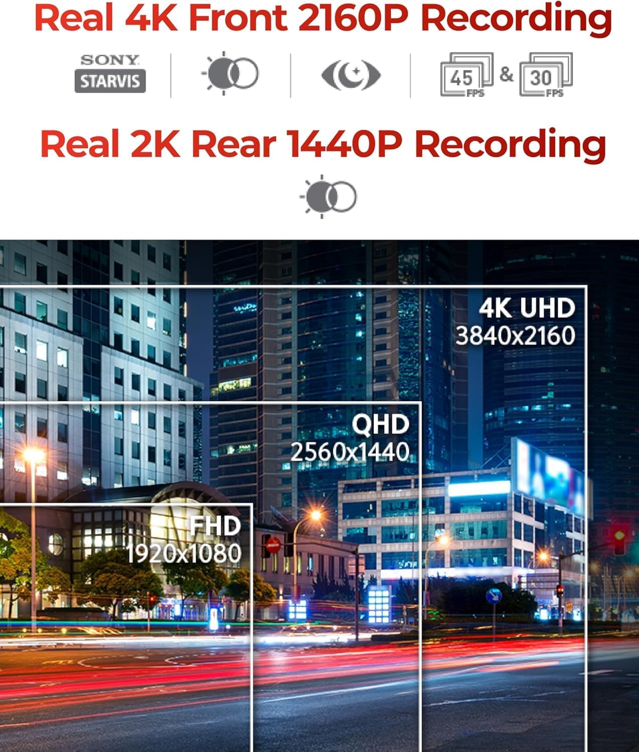 • 【4K UHD FRONT & 2K QHD REAR】Equipped with a high-performance Sony STARVIS IMX415 sensor, the front camera captures stunning 4K UHD video at 30fps, ensuring every detail is recorded with exceptional clarity. The rear Galaxycore GC4653 sensor delivers crisp 2K QHD footage, providing comprehensive coverage and enhanced visibility, day or night.
