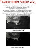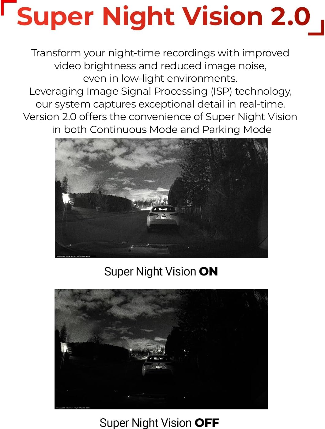 • 【SUPER NIGHT VISION 2.0】 Enhances video brightness and reduces image noise in low-light conditions, so you don’t miss important details while driving and parked.